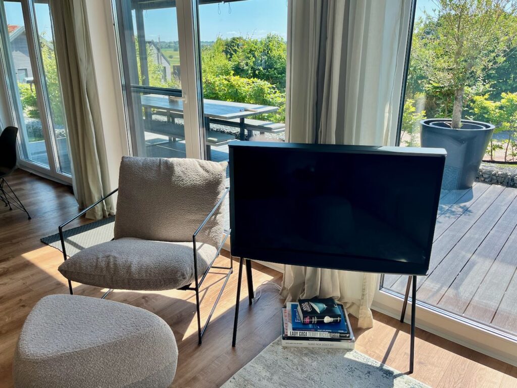 4K-TV Ferienhaus in der 'hey BEACHVILLA' finden Sie zwei moderne Samsung »The Serif« 4KTVs im Wohnzimmer und im Schlafzimmer im Obergeschoss.