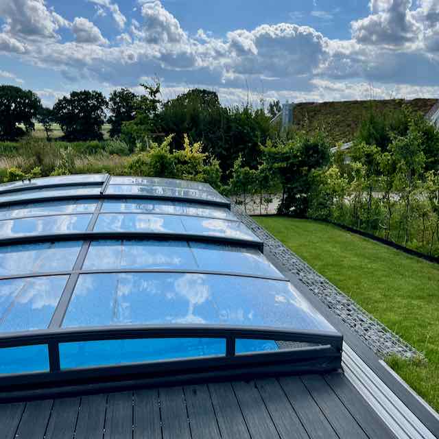 Der Pool verfügt über eine moderne Überdachung in klarer Glasoptik, unter der man auch bei Wind und